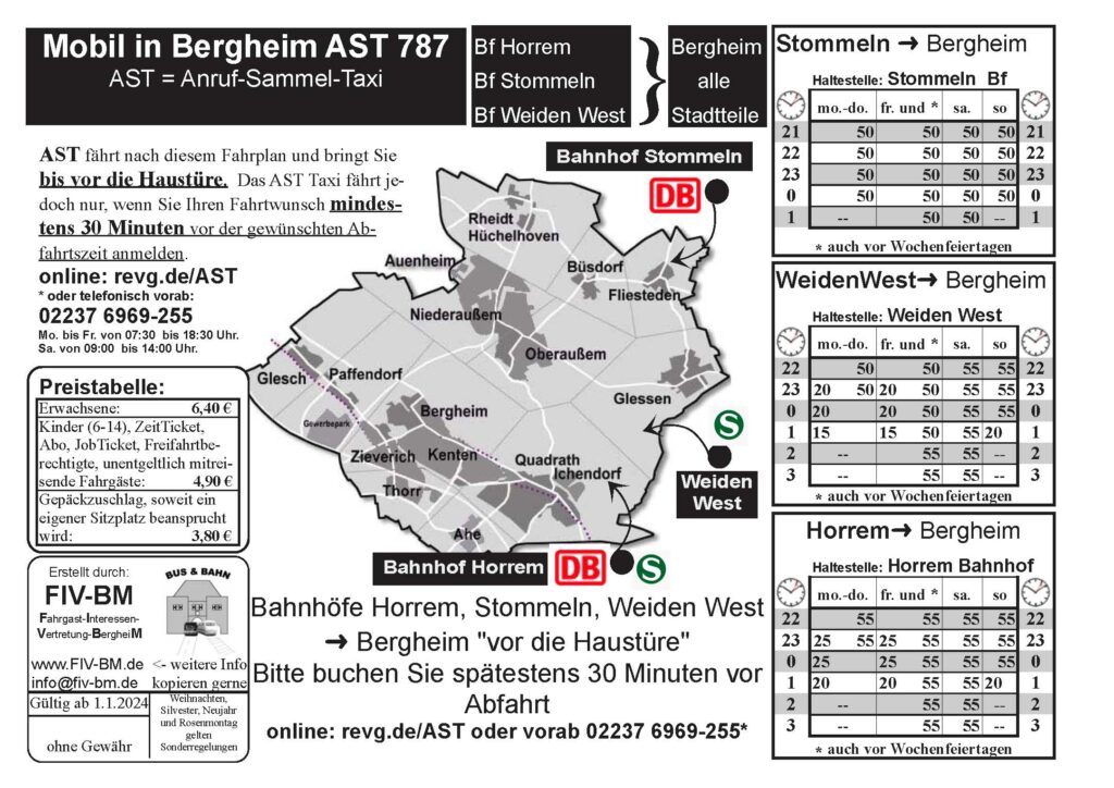 Wenn der Busverkehr am Abend seltener wird, dann kommt die Zeit des Anrufsammeltaxis (AST). In Bergheim gibt es viel AST Verkehr. Sowohl von allen Stadtteilen zueinander als auch von außerhalb, Horrem Bahnhof, Stommeln Bahnhof und Weiden West Bahnhof. Für Auenheim, Glessen und Büsdorf gibt es weitere Fahrten, auf die hier nicht eingegangen wird!