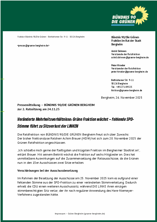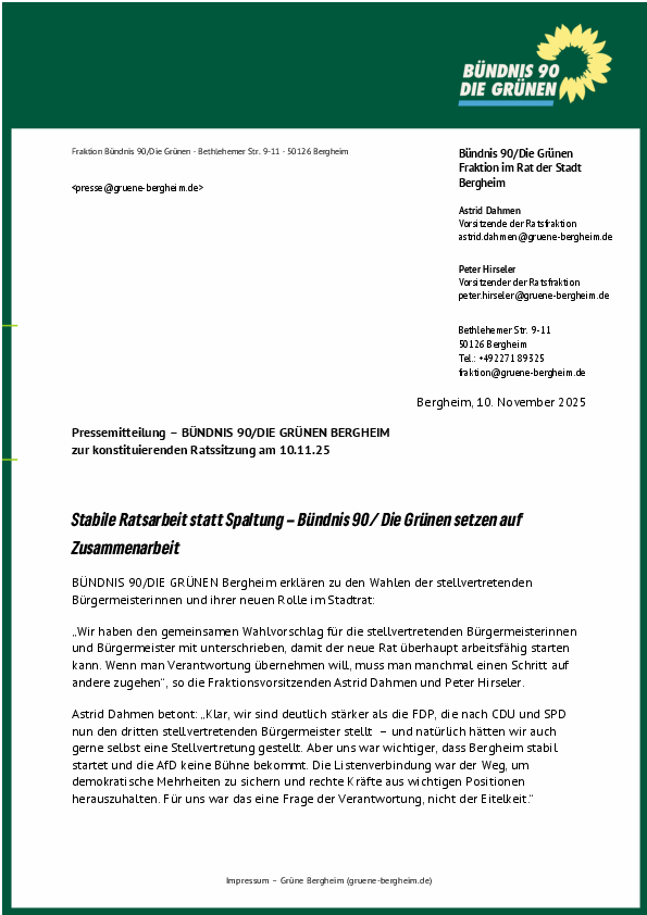 Ja, wir sind deutlich stärker als die FDP, die nach CDU und SPD nun den dritten stellvertretenden Bürgermeister stellt, und natürlich hätten wir uns auch eine eigene Stellvertretung vorstellen können. Entscheidend war für uns aber etwas anderes: dass Bergheim stabil startet und die AfD keine zusätzliche Aufwertung bekommt. Die Listenverbindung war aus unserer Sicht der Weg, demokratische Mehrheiten zu sichern und rechte Kräfte aus wichtigen Positionen herauszuhalten. Das war für uns eine Frage der Verantwortung, nicht der Eitelkeit.