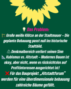 Die Stadt argumentiert, dass durch die innerstädtische Nachverdichtung weniger Flächen am Stadtrand versiegelt werden. Theoretisch ist das richtig – doch in der Praxis zeigt sich ein anderes Bild: Die Bebauung wird so groß wie möglich geplant, ohne echte Bürgerbeteiligung oder Rücksicht auf die historische Struktur des Ortskerns. Die Grünen hatten bereits 2022 vorgeschlagen, das Projekt transparenter zu gestalten und stärker an die örtlichen Gegebenheiten anzupassen – etwa durch Satteldächer und bessere Wegeverbindungen. Doch diese Vorschläge wurden ignoriert.