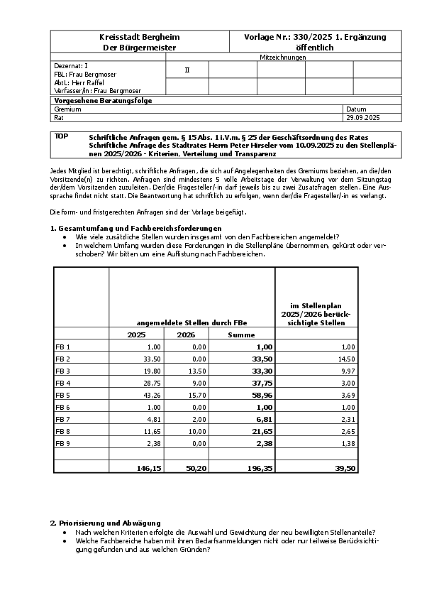 Eine leistungsfähige Verwaltung braucht ausreichend Personal – aber auch klare Prioritäten, Transparenz und gerechte Verteilung. Deshalb haben wir in der Ratssitzung am 10. September 2025 eine Anfrage zu den neuen Stellenplänen der Stadt gestellt.