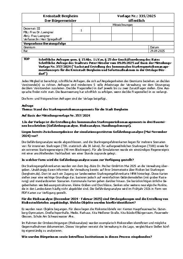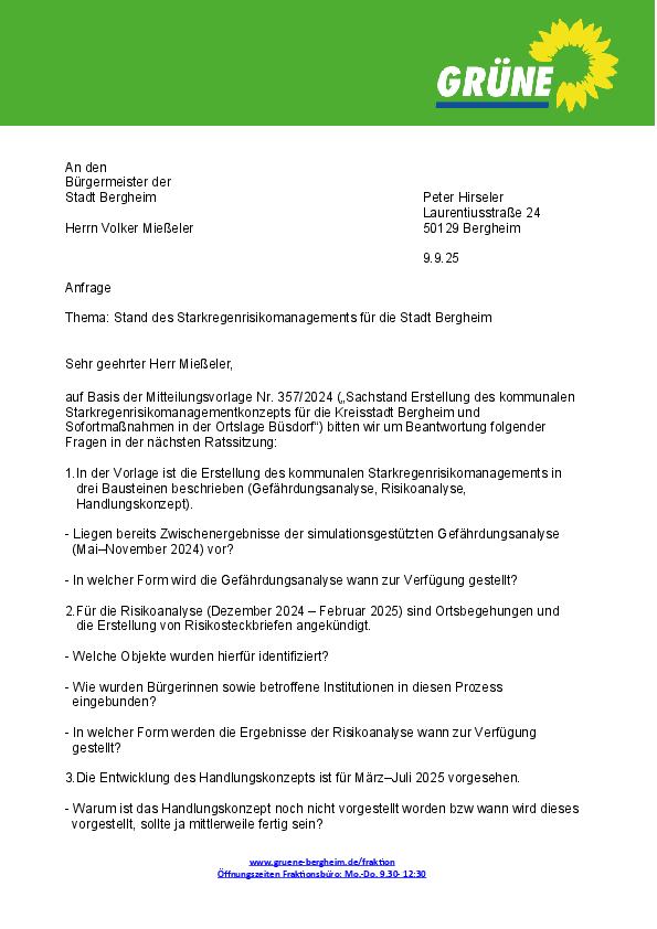 Die Starkregenereignisse der letzten Jahre – insbesondere die Katastrophe 2021 und die Überschwemmungen im Sommer 2024 – haben deutlich gemacht, wie verletzlich Bergheim bei Extremwetter ist. Trotzdem liegt auch vier Jahre nach der Katastrophe noch kein fertiges Starkregenrisikomanagement für die Stadt vor.
