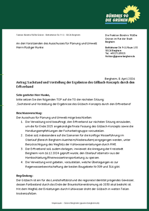 Mit unserem Antrag möchten wir den aktuellen Stand des Gillbach-Konzepts transparent im Ausschuss für Planung und Umwelt vorstellen lassen. Der Erftverband soll darlegen, welche Lösungen für die zukünftige Wasserführung – insbesondere im Oberlauf bei Auenheim und Niederaußem – geprüft werden und welche Handlungsempfehlungen die Facharbeitsgruppe erarbeitet hat. Dabei soll auch bewertet werden, ob eine alternative Speisung, etwa über die Rheinwassertransportleitung, möglich ist. Zudem sollen die Auswirkungen auf die Regenwasserbewirtschaftung in den Baugebieten „Im Euel“ und „Fortuna Quartier“ erläutert werden.