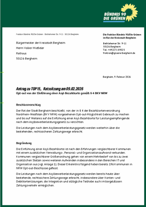 Antrag zu TOP 15 - Opt-out von der Einführung einer Asyl-Bezahlkarte gemäß § 4 BKV NRW