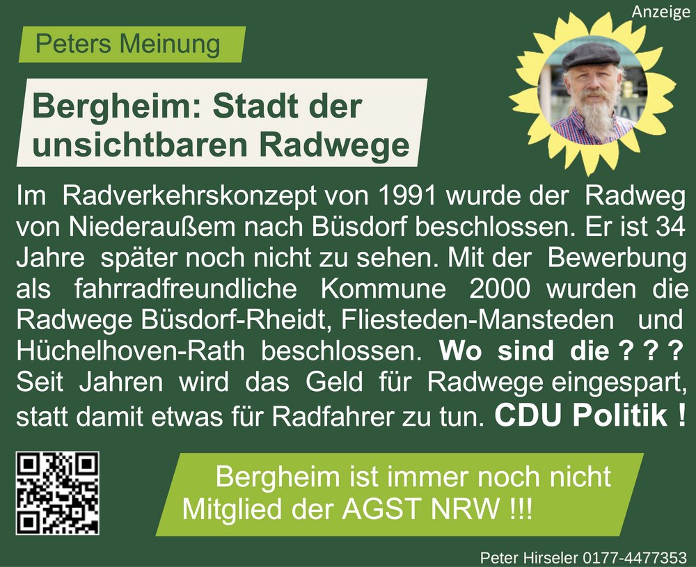 Bergheim, eine Stadt mit ehrgeizigen Versprechen zur Förderung des Radverkehrs, bleibt seit Jahrzehnten hinter ihren eigenen Zielen zurück. Bereits 1991 wurde im Radverkehrskonzept der Bau des Radwegs von Niederaußem nach Büsdorf beschlossen – doch bis heute ist davon nichts zu sehen. Dies ist nur ein Beispiel für eine lange Liste unerfüllter Zusagen.