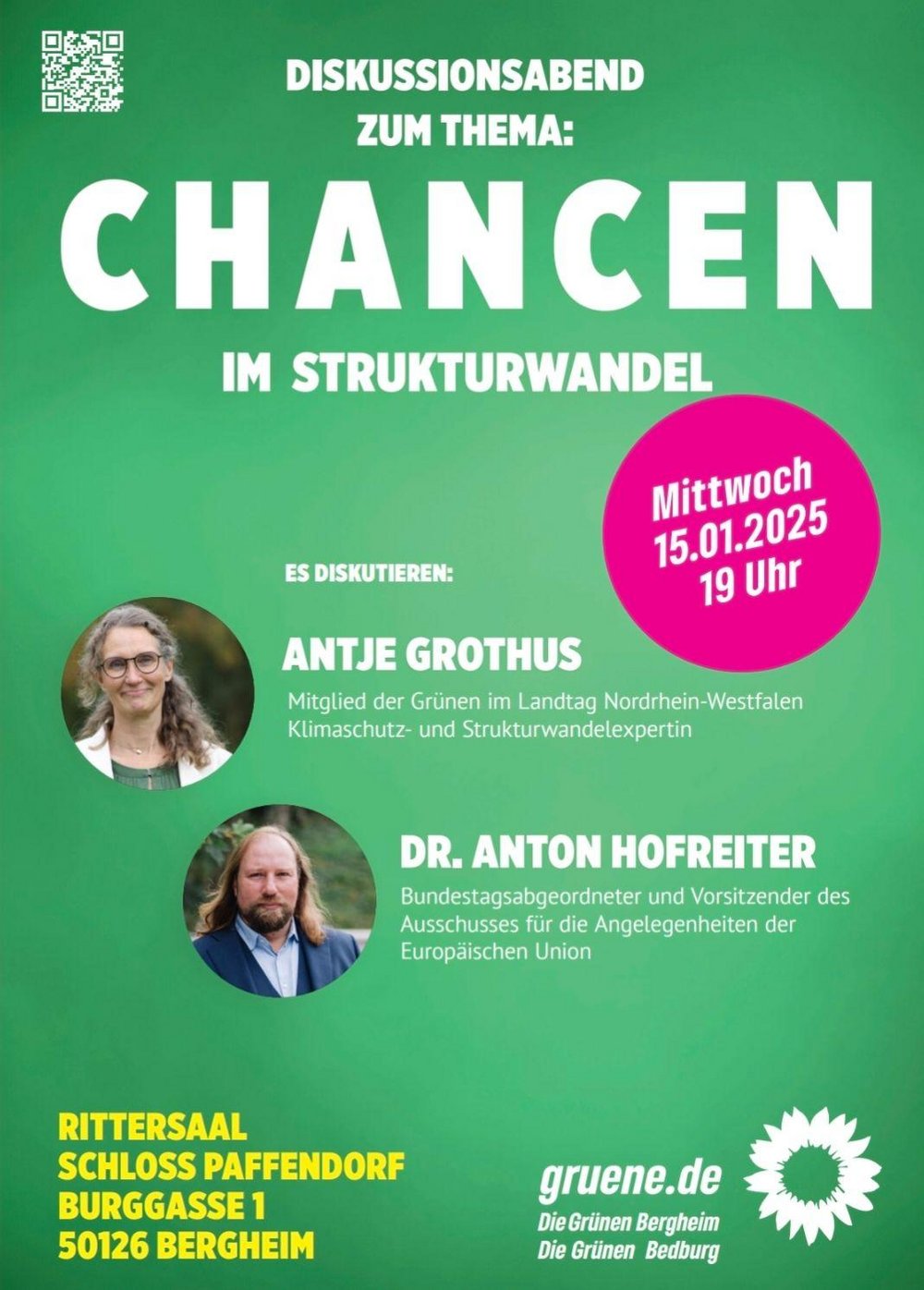 Am 15. Januar findet unsere Veranstaltung Chancen im Strukturwandel um 19 Uhr im Rittersaal Schloss Paffendorf Burggasse 1 50126 Bergheim statt. Freut euch auf eine spannende Diskussion zu dem für die Stadt Bergheim bewegenden Thema: Strukturwandel.